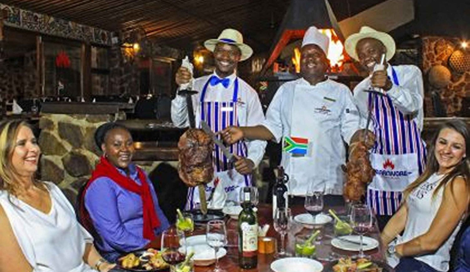 Normally waiters welcome you for starters with a delicious hot soup, and then carry the meat swords around the restaurant, carving unlimited amounts of the prime meats onto sizzling, cast iron plates in front of you. A wide selection of salads, vegetable side dishes, and a variety of exotic sauces accompany the meat feast.